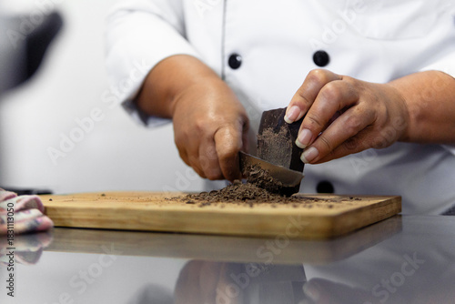 chef, hand, chocolate, cooking, preparing, dessert, confectioner, baking, cutting, grating, shaving, chopping, food, sweet, ingredient, epicure, delicious, pastry, kitchen, professional, person, making, process, skill, art, culinary, gastronomy, closeup, detailed, table, wooden board, uniform, white, black, brown, dark, rich, favor, fresh, natural, organic, healthy, homemade, eatery, cafes, industry, training, class, education