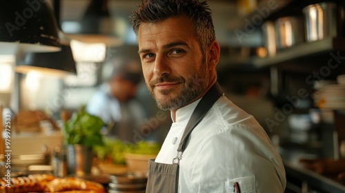 chef in the kitchen, with his back to the camera, in a naturally lit environment