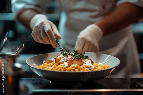 food, pasta, dish, chef, cooking, eatery, culinary, creamy, sauce, seafood, plate, glove, preparation, dinner, meal, cookery, delicious, appetising, gastronomy, white, elegant, professional, photo, closeup, high-quality, epicure, epicure, fine, dining, italian, styling, serving, warm, lighting, indoor, setting, hand, parsley, garnish, tasty, art, presentation, kitchen, background