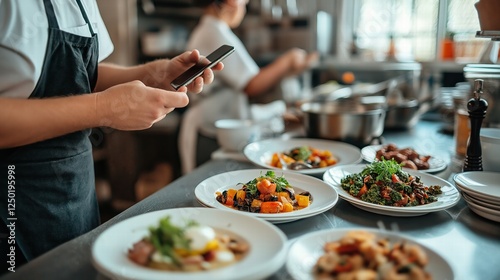 chef is using a small bowl to arrange food on white plates, holding and looking at their phone