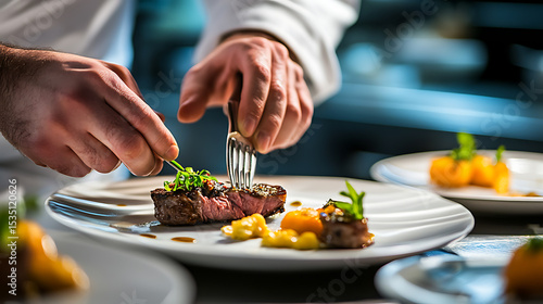 Chef meticulously garnishing a plated steak with fresh herbs and colorful vegetables