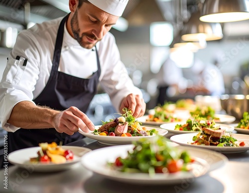 Chef meticulously plates gourmet salads and entrees in a professional kitchen setting