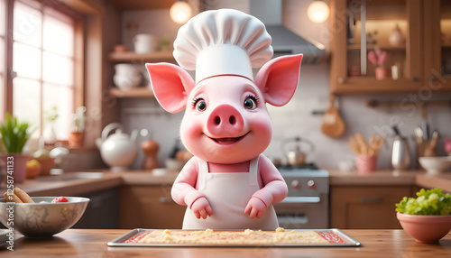 pig, chef, cooking, pizza, kitchen, cute, adorable, cartoon, illustration, food, baking, pastry, happy, smiling, apron, funny, character, home cooking, receipe, ingredient, domestic, fun, whimsical, sweet, delicious, tasty, meal, eatery, bakery, food preparation, cheese, vegetable, herb