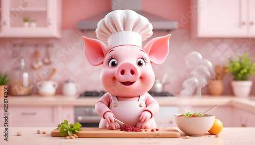 Chef Pig Preparing Delicious Food in a Pink Kitchen