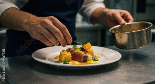 chef, food, cooking, kitchen, eatery, epicure, fine dining, plating, presentation, dish, meal, hand, tweezer, garnish, sauce, tuna, fish, vegetable, preparation, professional, culinary, skill, precision, elegant, craft, serving, counter, indoor, detail, ingredient, fresh, healthy, quality, exclusive, art, technique, plate, white, metal, stainless steel