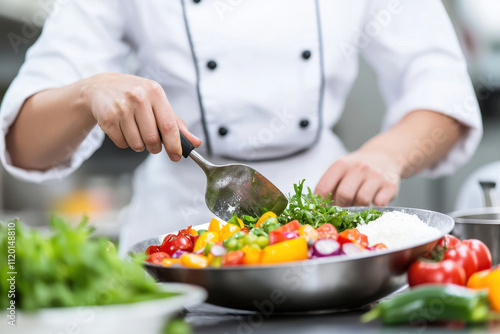 Chef preparing a fresh salad with vibrant vegetables in a modern kitchen.