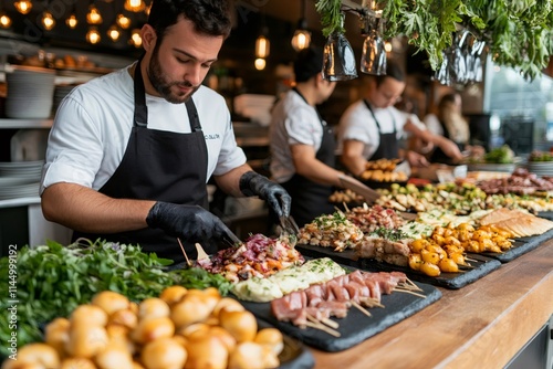 chef, catering, eatery, kitchen, food, skewer, preparing, event, grilled, meat, vegetable, buffet, service, culinary, professional, cook, meal, cookery, gastronomy, dinner, lunch, party, celebration, hospitality, banquet, epicure, delicious, healthy, fresh, wooden table, teamwork, staff, business, job, occupation, skill, expertise, food industry, food preparation