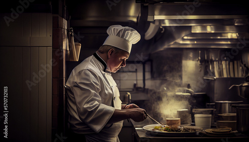 Chef preparing food in the kitchen of a restaurant, generative ai