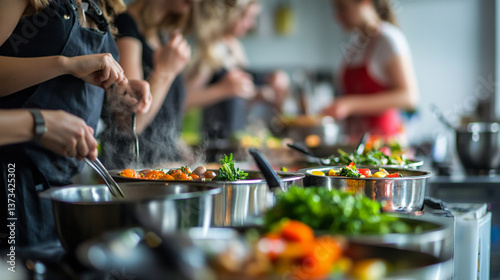 food, kitchen, cooking, woman, eatery, dinner, chef, eating, meal, cook, people, home, dish, lunch, plate, meat, table, cookery, buffet, tasty, epicure, vegetable, party, couple, knife