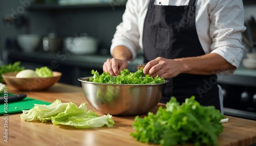 chef, salad, kitchen, cooking, culinary, fresh, healthy, ingredient, professional, food, preparation, chopping, apron, hand, epicure, receipe, delicious, meal, lettuce, vegetable, bowl, garnish, green, organic, nourishment, diet, chopping board, eatery, gastro, culinary arts, cookery, taste, favor, dish, serving, cook, health, lifestyle, vibrant, slicing