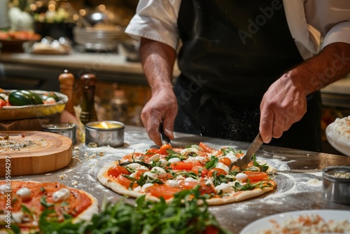 pizza, cooking, chef, eatery, hand, knife, preparation, italian food, dough, mozzarella, arugula, cherry tomato, cheese, culinary, kitchen, artisan, cookery, pizzeria, food preparation, epicure, baking, homemade, traditional, handcraft, culinary arts, epicure, eating, fast, baked, tasty, delicious, slice