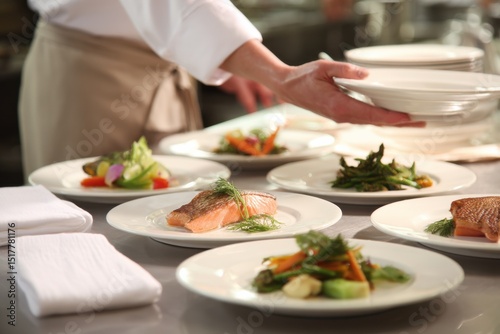 gastronomy, culinary, expertise, service, eatery, kitchen, preparation, epicure, dining, catering, hospitality, professional, freshness, quality, presentation, skill, creativity, innovation, artistry, tradition, elegance, sophistication, healthy, nourishment, diet, well-being, lifestyle, balance, indulgence, celebration, gathering, event, occasion, promotion, advertisement, menu, receipe, salmon, plate, vegetable, dill, chef, hand, table, food, cookery, asparagus, carrot, towel