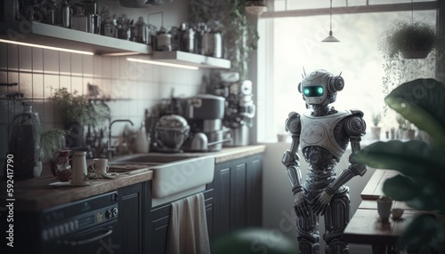 Chef robot Cooking In the kitchen of the future home genius. Intelligent robots work in modern homes, future lifestyle ideas. Generative AI
