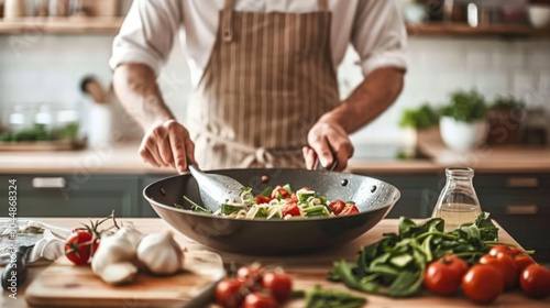 chef skillfully stirs fresh vegetables in wok, surrounded by ingredients like tomatoes and garlic, creating vibrant and healthy dish