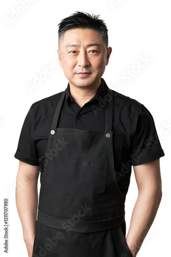 Chef standing confidently in black apron with arms crossed isolated on white background professional culinary expert portrait restaurant owner style.