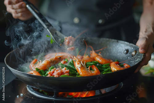 chef, stir fry, shrimp, wok, cooking, flames, steam, food, seafood, kitchen, epicure, culinary, heat, sauté, vegetable, healthy, cookery, preparation, meal, stove, dinner, fresh, ingredient, eatery, action, motion, asian cuisine, gastronomy, skilled, professional, cookware, frying, nourishment, spicey, hot, fire, chinese food, savoury