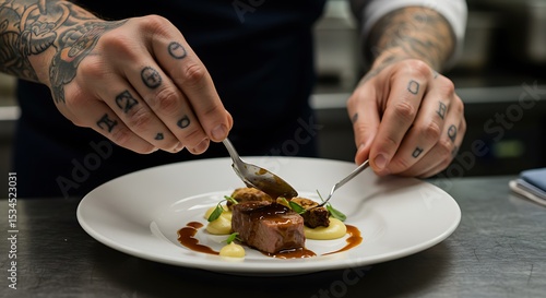 culinary arts, hand, plating, chef, closeup, tattoo, detail, epicure