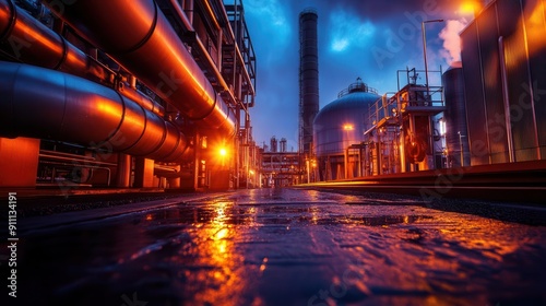Chemical processing, vibrant colors, dynamic scenes, industrial setting, detailed