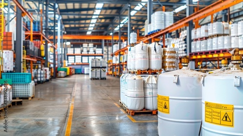 Chemical storage warehouse. Containers for chemical liquids. Warehouse system. Toxic barrels are kept in stock. Warehouse storage. Chemical Industry. Plastic barrels of chemicals are on pallets.