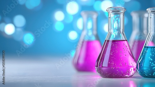 Chemistry Laboratory Shadows with Colorful Erlenmeyer Flasks of Blue and Pink Liquids on a Bench with Bokeh Background