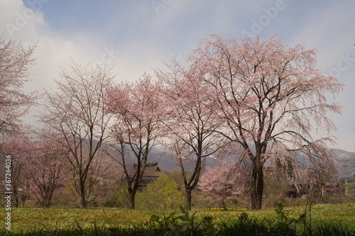 cherry blossom full bloomed with mountains in Japan