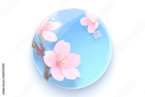 Cherry blossoms adorn a light blue circle, reminiscent of spring