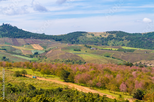 Cherry blossoms are blooming on the mountain in Phu Lom Lo, Phitsanulok Province, Thailand.