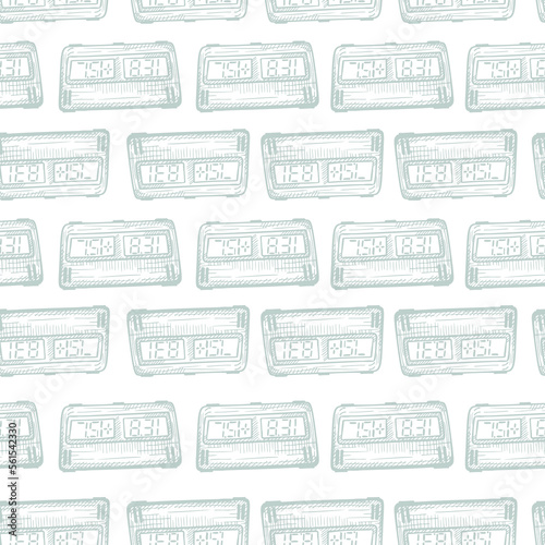 Chess clock electric engraved seamless pattern. Retro watch for chess game in hand drawn style. Sketch texture for fabric, wallpaper, textile, print, title, wrapping paper. Vector illustration.