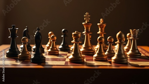Chess pieces arranged strategically on a wooden board, highlighted by warm directional lighting.