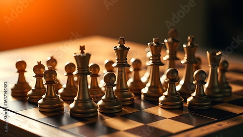 Chess pieces arranged strategically on a wooden board, highlighted by warm directional lighting.
