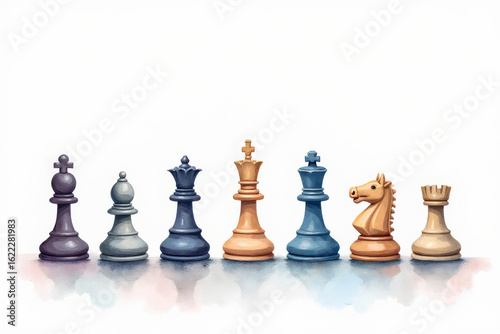 Chess pieces illustration on a white background, isolated, perfect for strategy games and educational purposes.
