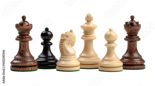 Chess pieces lineup: An array of beautifully crafted chess pieces stands at attention, ready to engage in a game of strategy and intellect, the dark and light figures contrasting sharply.