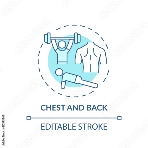 Chest and back concept icon. Physical training type idea thin line illustration. Training arms and shoulders together. Lifting heavy weights. Vector isolated outline RGB color drawing. Editable stroke