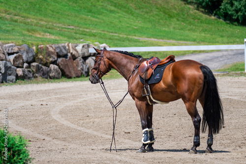 Chestnut horse in competition without rider