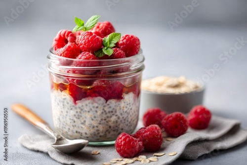 raspberry, healthy breakfast, berry, oat, honey, mint, nourishment, vegan, dessert, raw, diet, vegetarian, freshness, sweet, fruit, organic, natural, summer, food, glasses, detox, energy, epicure, light, homemade, wholesome, delicious, snack, tasty, yogurt, ingredient, berry, plant, well-being, spoon, grey background, studio shot, ready to eat, antioxidant, fiber, omega 3, protein, healthy lifestyle, fitness