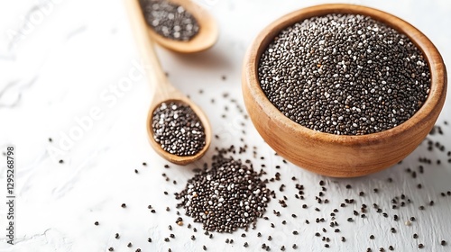 Chia Seeds in Wooden Bowl and Spoons: Healthy Eating, Superfood, Nutrition