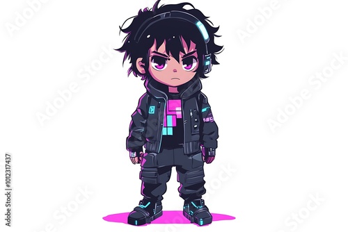 Chibi anime boy with cyberpunk style fashion and glowing pink eyes