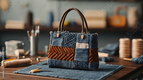pursed, denim, leather, handle, stylish, fashion, blue, accessory, table, modern, quality, casual attire, unique, practical, sustainable, trendy, handcraft, artsy, design, textile, attractive, vintage, versatile, hard-wearing, environmentally friendly, lifestyle, creative, presentation, minimalistic, character, aesthetic, innovation, texture, visual, chic, detail, urban, everyday
