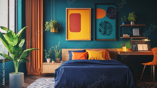 Chic modern bedroom with bold abstract color themes, framed artwork, cozy furniture, and a stylish workspace. --chaos 20 --ar 16:9 --quality 2 --v 6.1 Job ID: 9d1f018a-fae4-4027-8e63-f472981f82a4