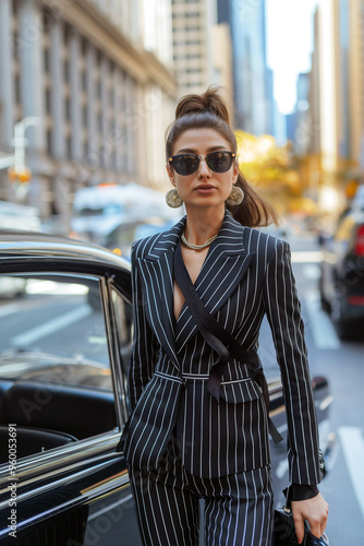 Chic woman in a tailored pinstripe suit, wearing sunglasses and a designer handbag standing on a city street near a classic car.