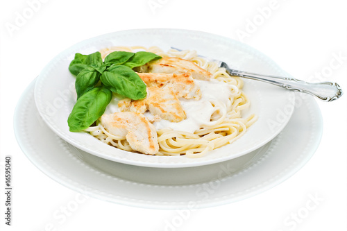 Chicken alfredo with basil isolated on white with clipping path