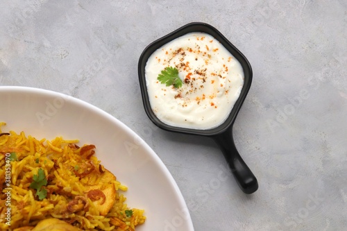Chicken Biryani/murg Pulao. Garnished with fried onion & chopped coriander. Biryani served with raita is a famous Spicy non vegetarian dish of India. Along with copy space.