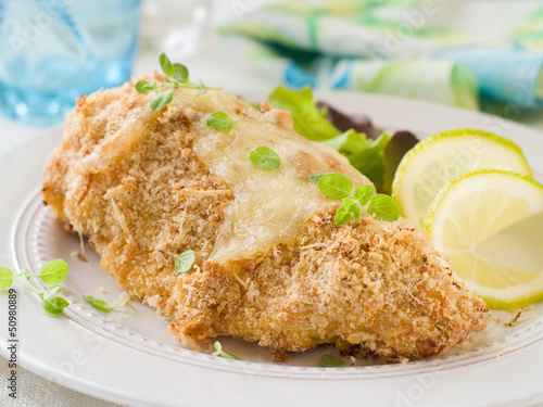 chicken, breast, bread, lettuce, glasses, drink, crumb, lemon, oregano, grill, grilled, meal, plate, meat, cooked, dinner, food, white, diet, prepared, ready, healthy, cook, cookery, herb, nourishment, health, served