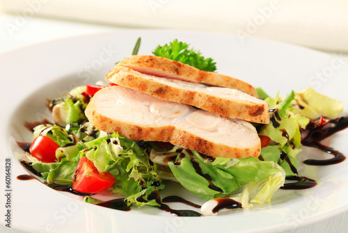 chicken, turkey, meat, fillet, chicken breast, sliced, grilled, roasted, baked, boneless, soy sauce, dressing, salad, vegetable, lettuce, tomatoes, fresh, food, lunch, meal, cooked, healthy, plate, white, closeup, nobody