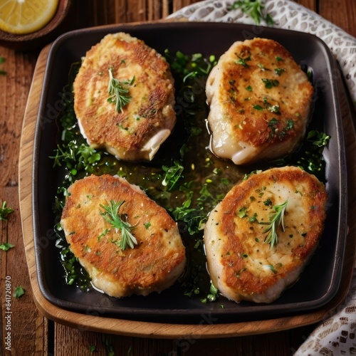 Chicken cutlets images fried chicken with lemon, tomatoes and onion