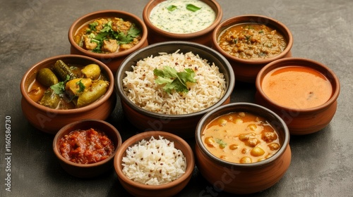Chicken dhum biriyani using jeera rice and spices arranged in earthen ware with raitha and lemon pickle on grey background.