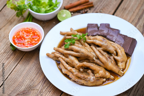 chicken feet soup stewed, cooking chicken feet foot stew on white with herbs and spices ingredients with chilli lemon vegetable on wooden background, Asian chinese food menu stew - Thai food