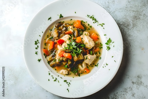 Chicken fricassee with mushrooms and cream, elegantly garnished for a gourmet touch