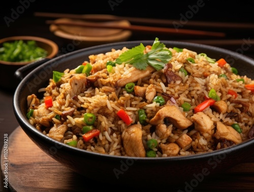 Chicken fried rice cooked and presented in a wooden setting viewed from the front