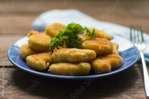 chicken nuggets fried to Golden brown with parsley on wooden background